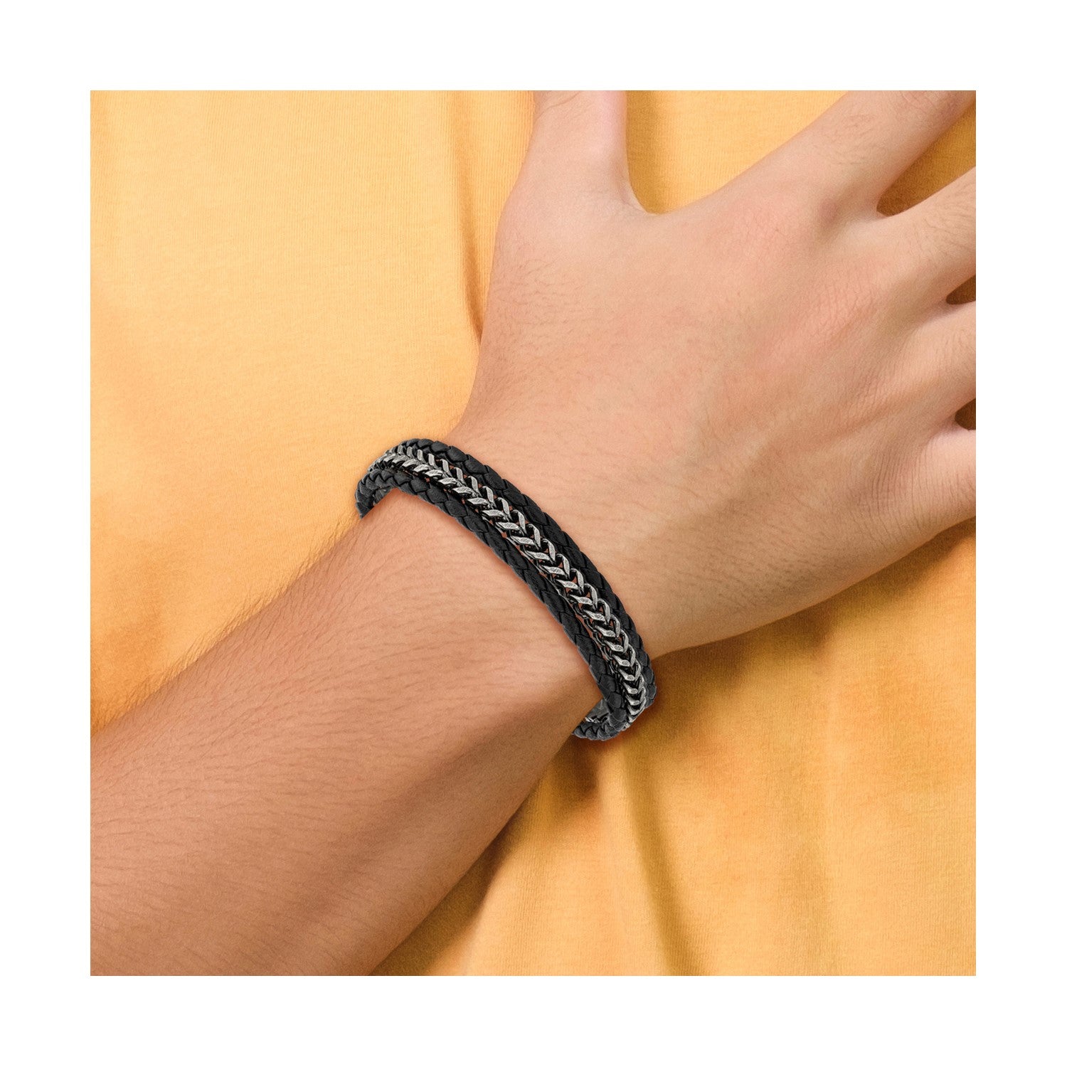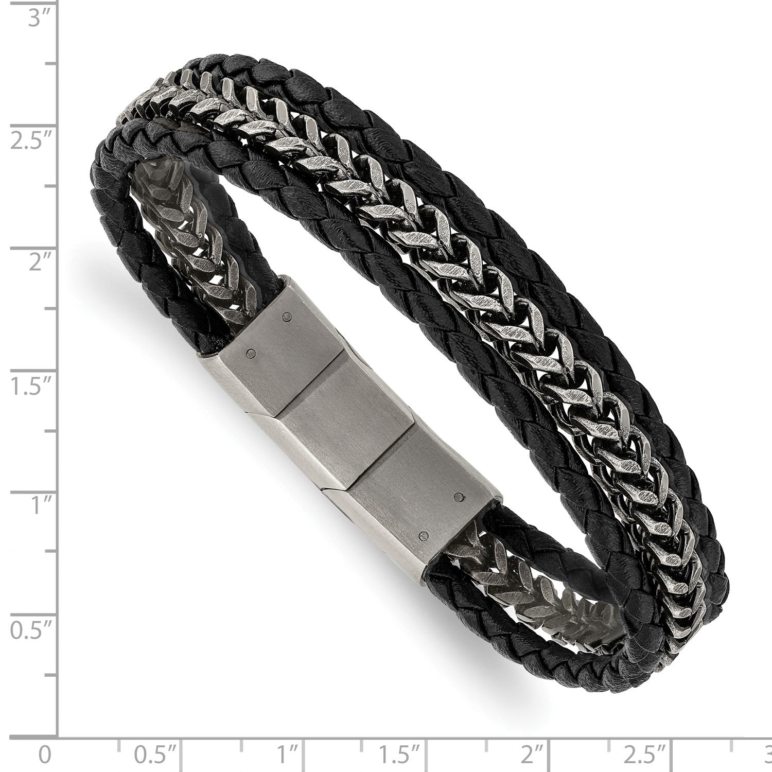 MJ Stainless Steel Antiqued and Brushed Multi Strand Chain and Black Leather 8.25 inch Bracelet with .5 inch Extension