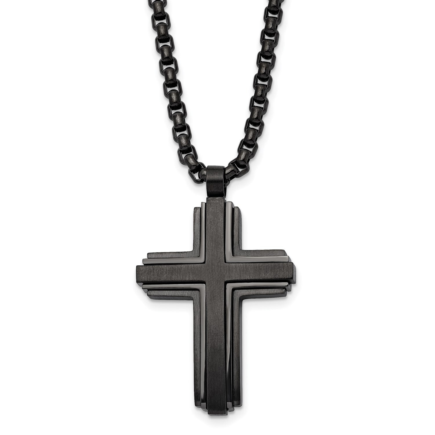 MJ Stainless Steel Brushed and Polished Black IP-plated Cross Pendant on a 24 inch Box Chain Necklace