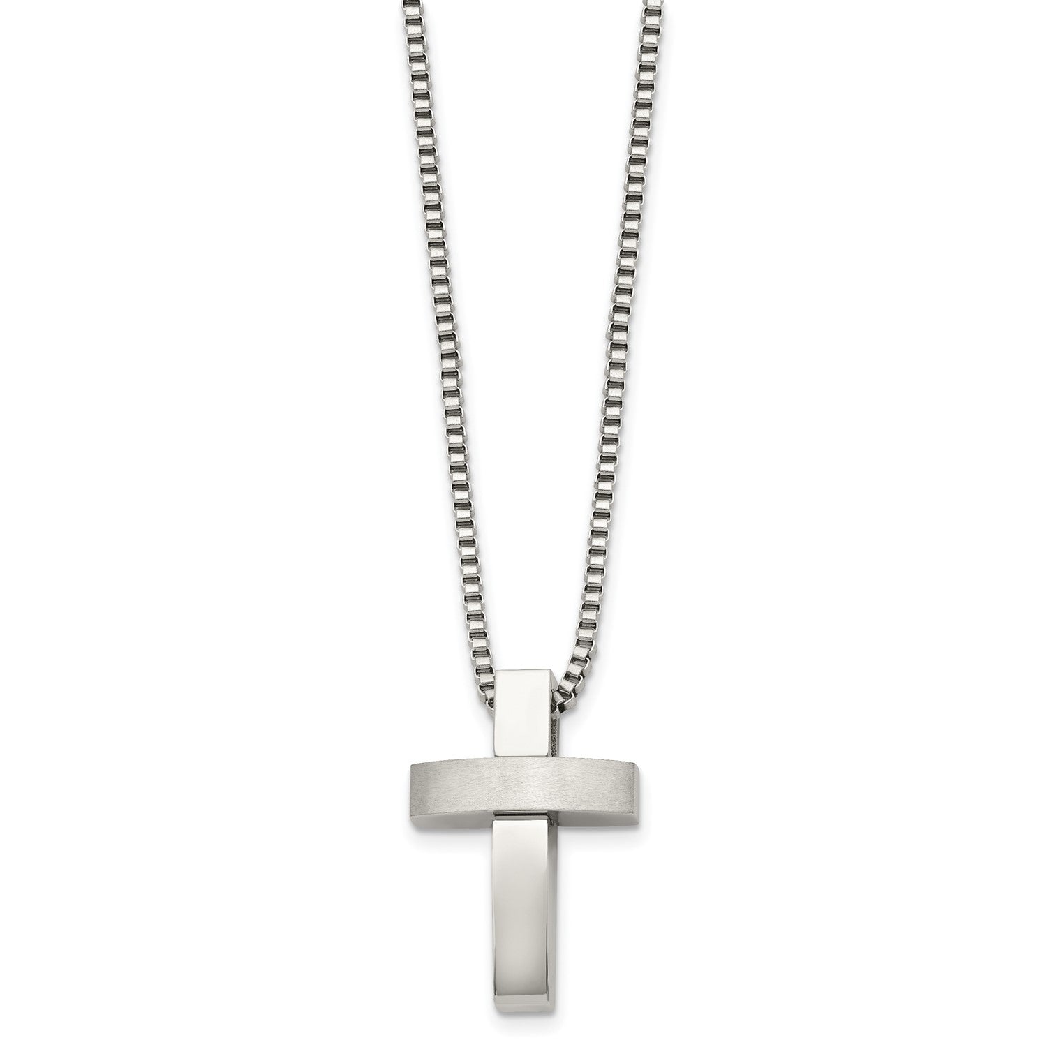 MJ Stainless Steel Brushed and Polished Cross Pendant on a 22 inch Box Chain Necklace