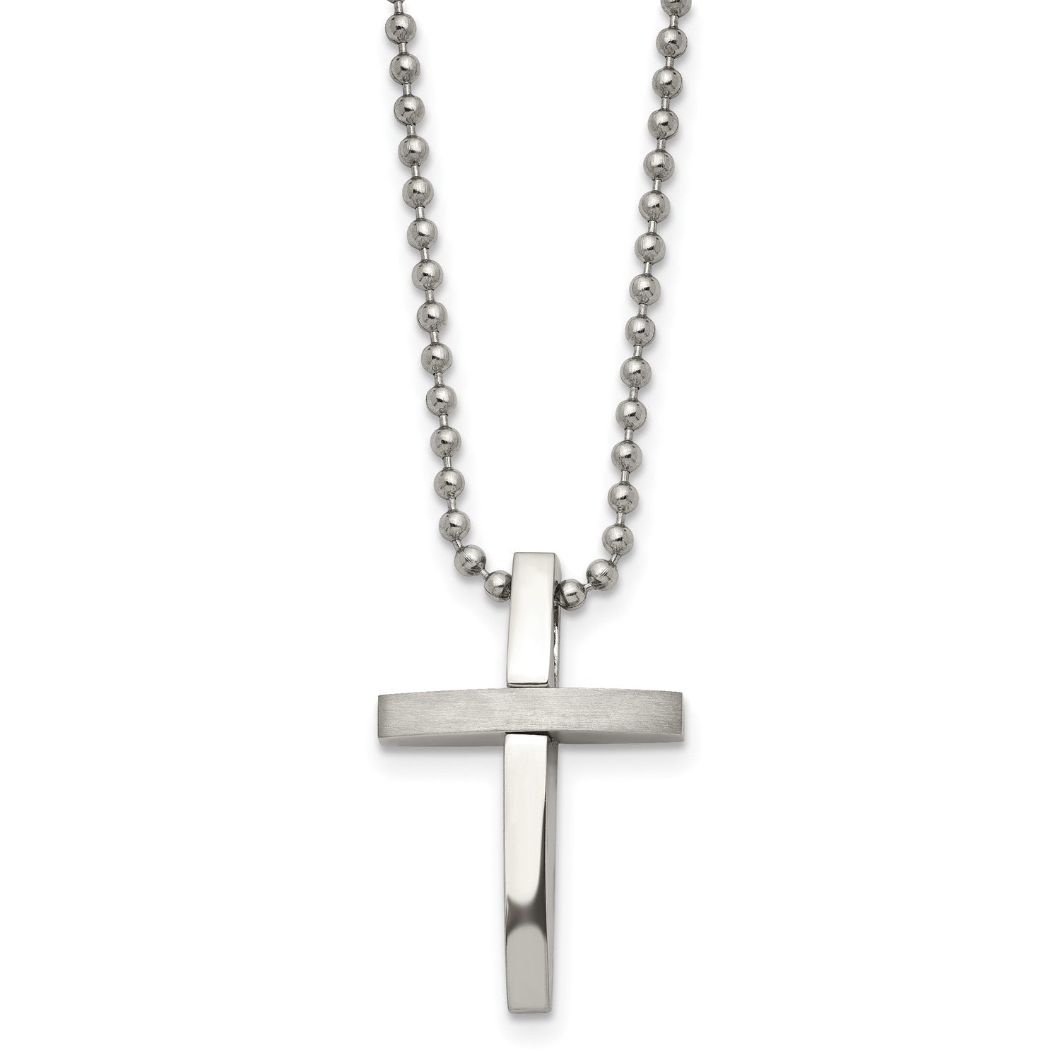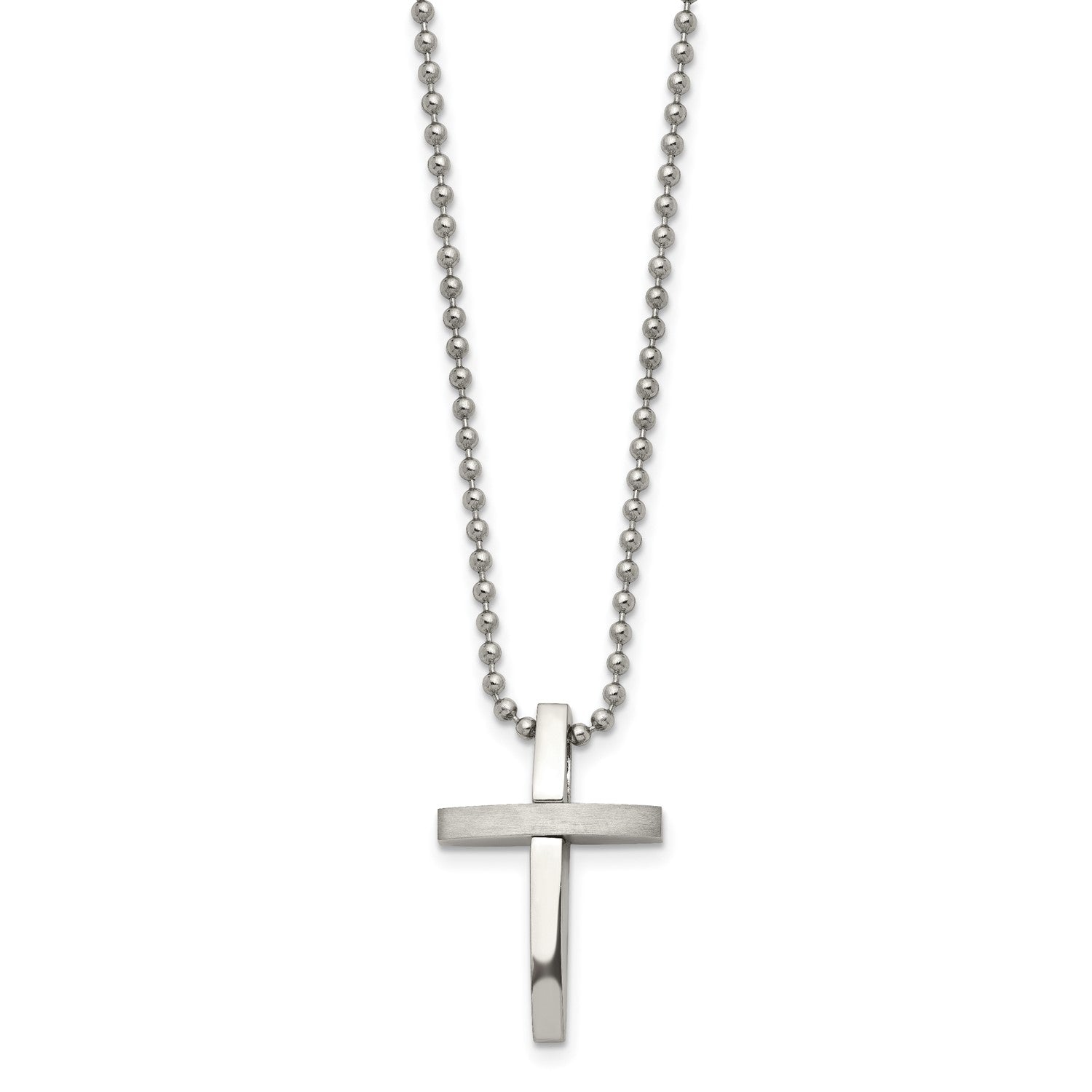 MJ Stainless Steel Brushed and Polished Cross Pendant on an 18 inch Ball Chain Necklace
