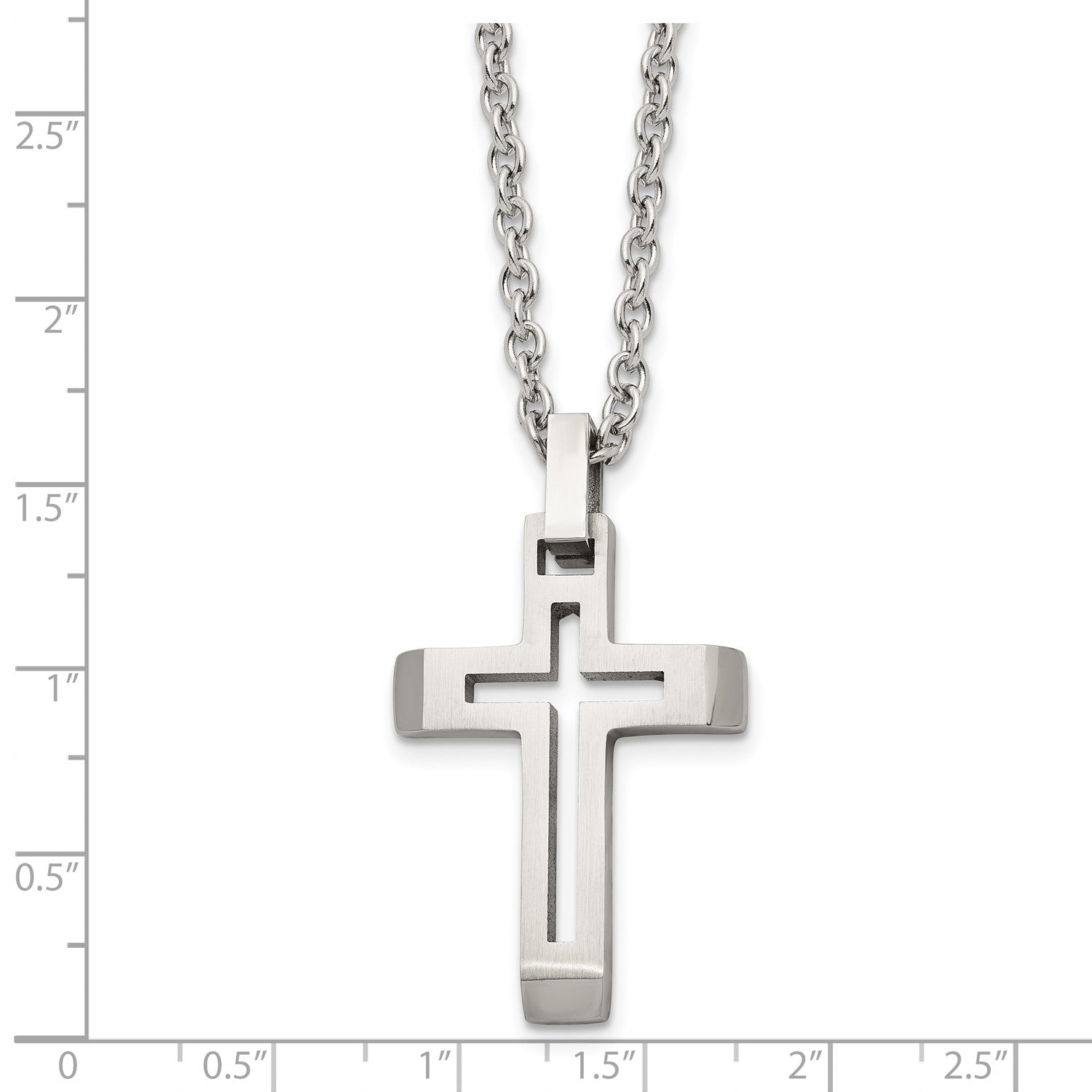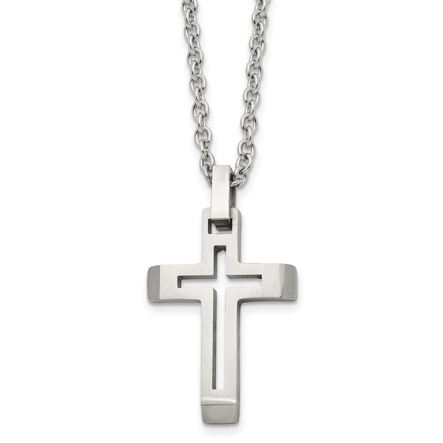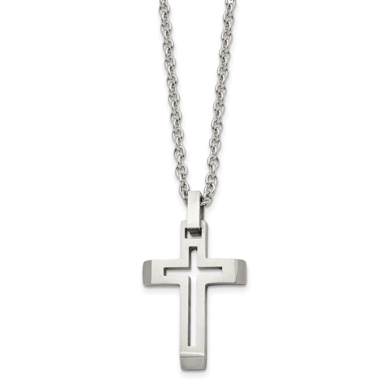MJ Stainless Steel Brushed and Polished Cut-out Cross Pendant on a 20 inch Cable Chain Necklace