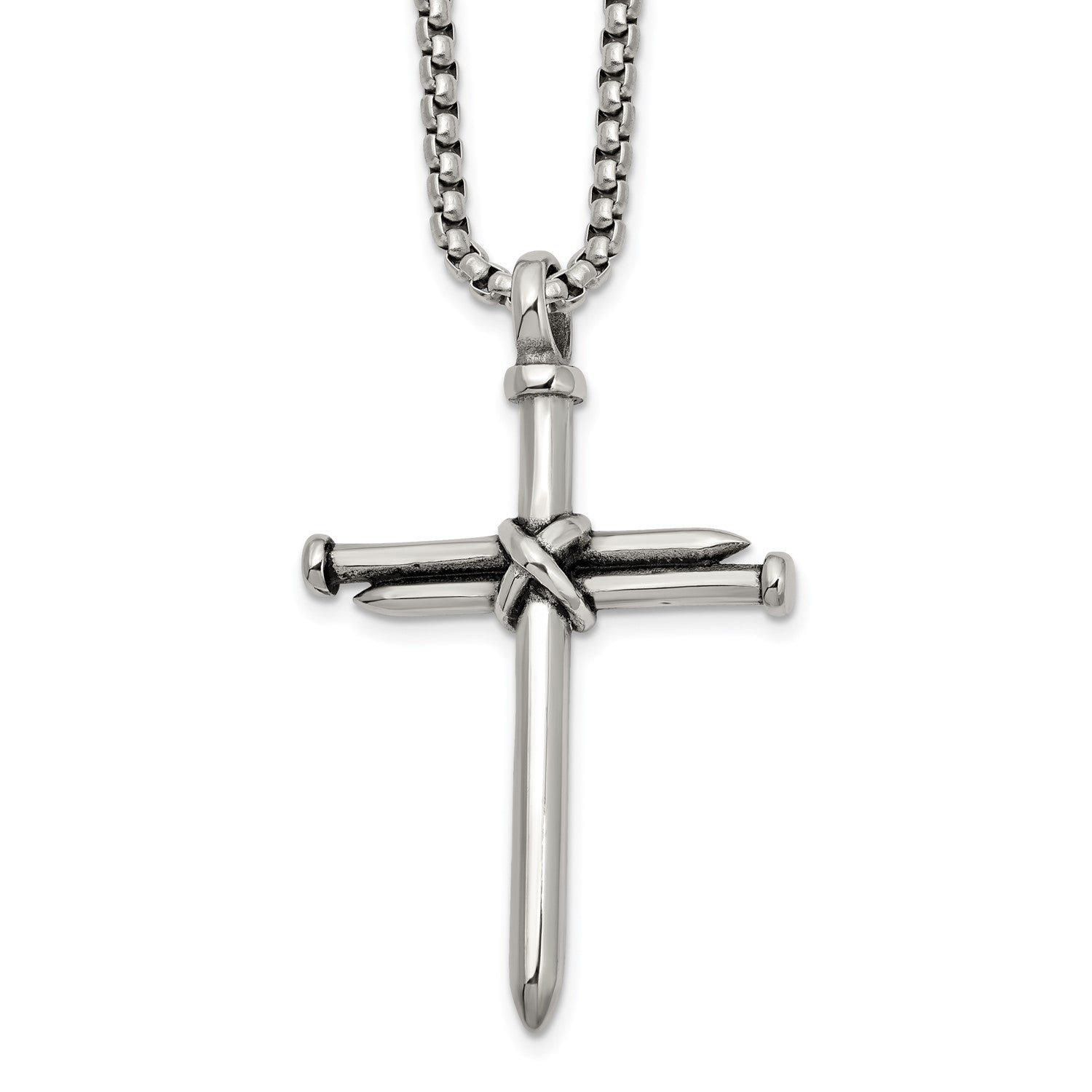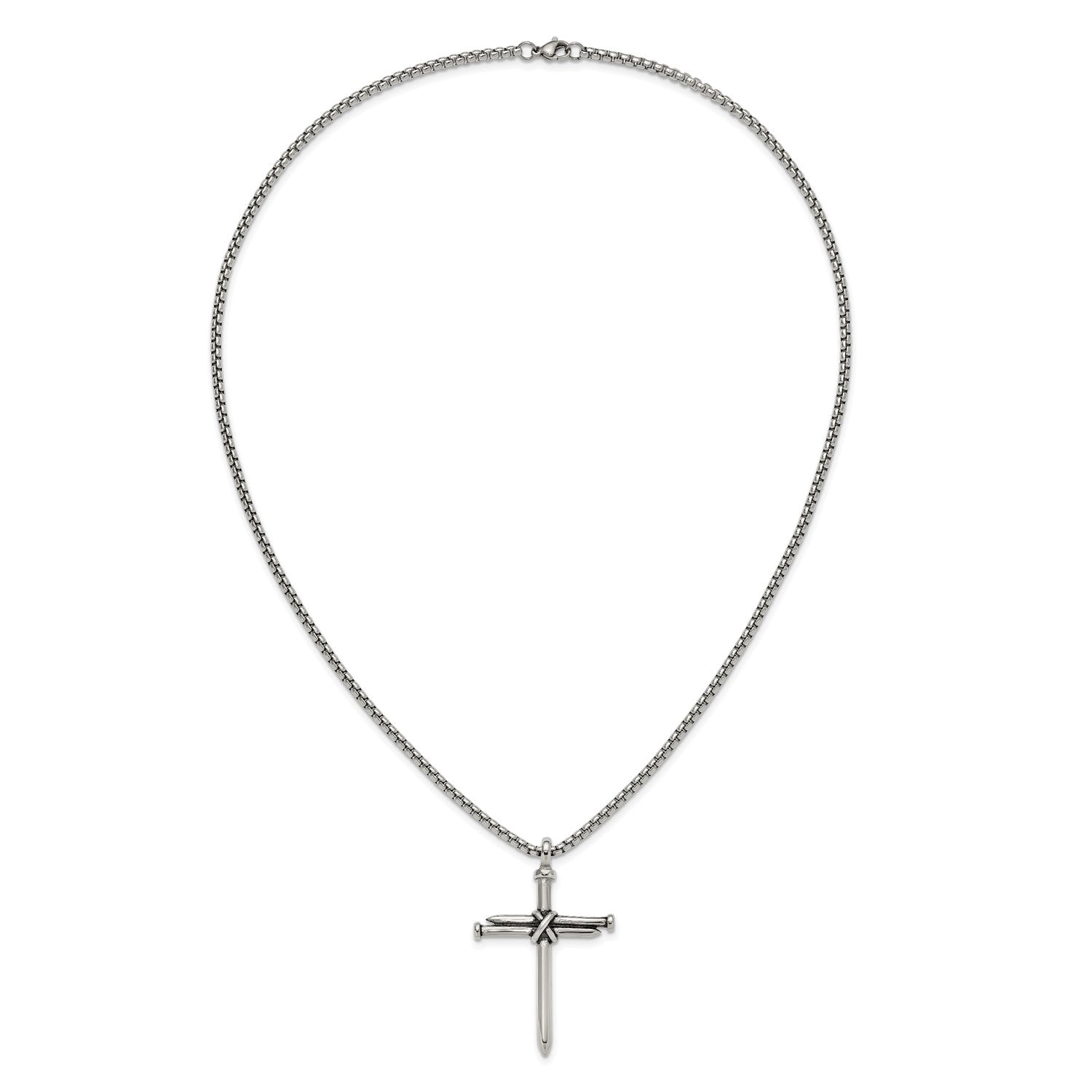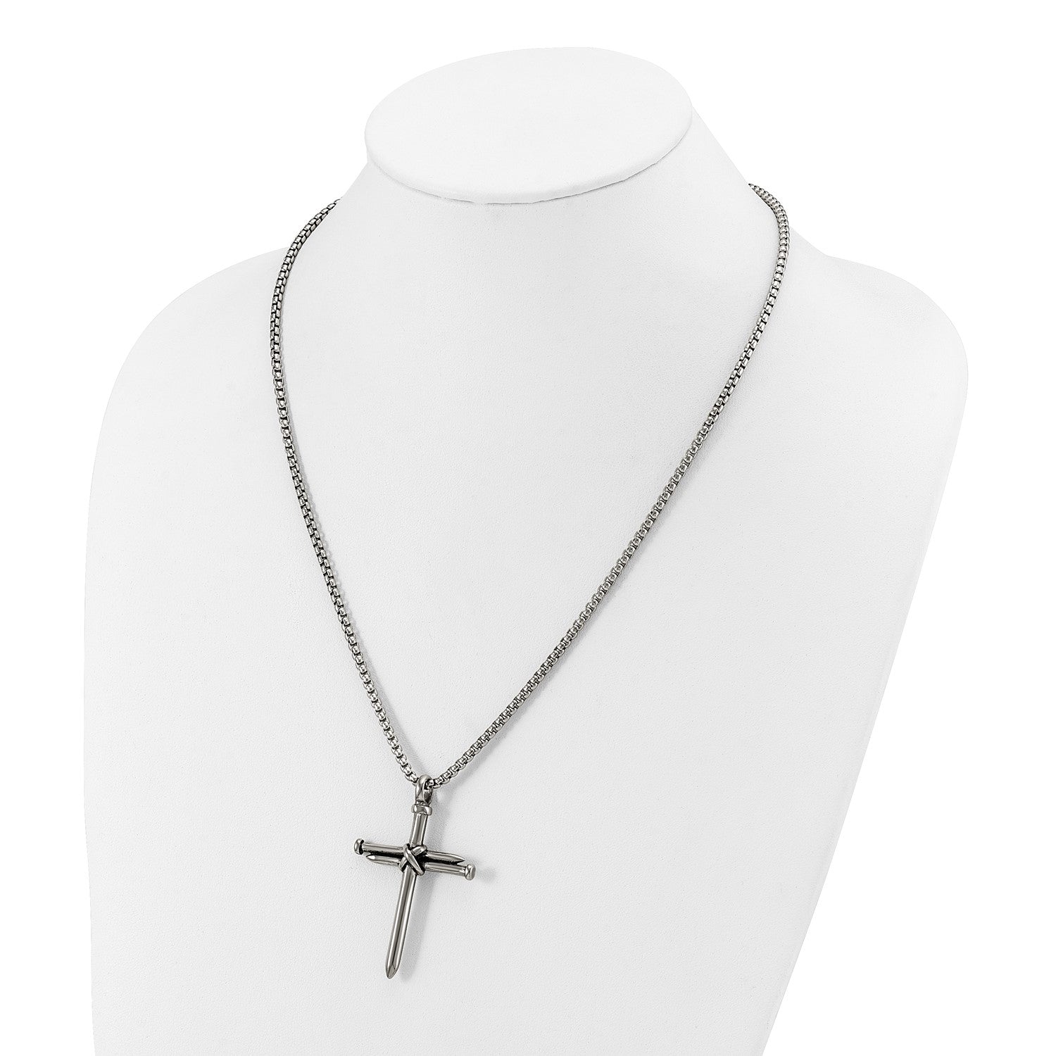 MJ Stainless Steel Polished Antiqued and Polished Cross of Nails Pendant on a 22 inch Box Chain Necklace