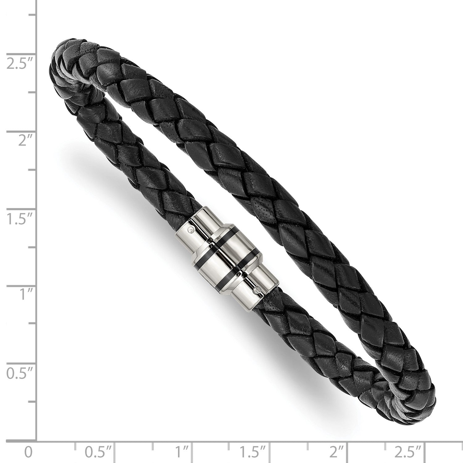 MJ Stainless Steel Polished Black IP-plated Black Braided Leather 9 inch Bracelet