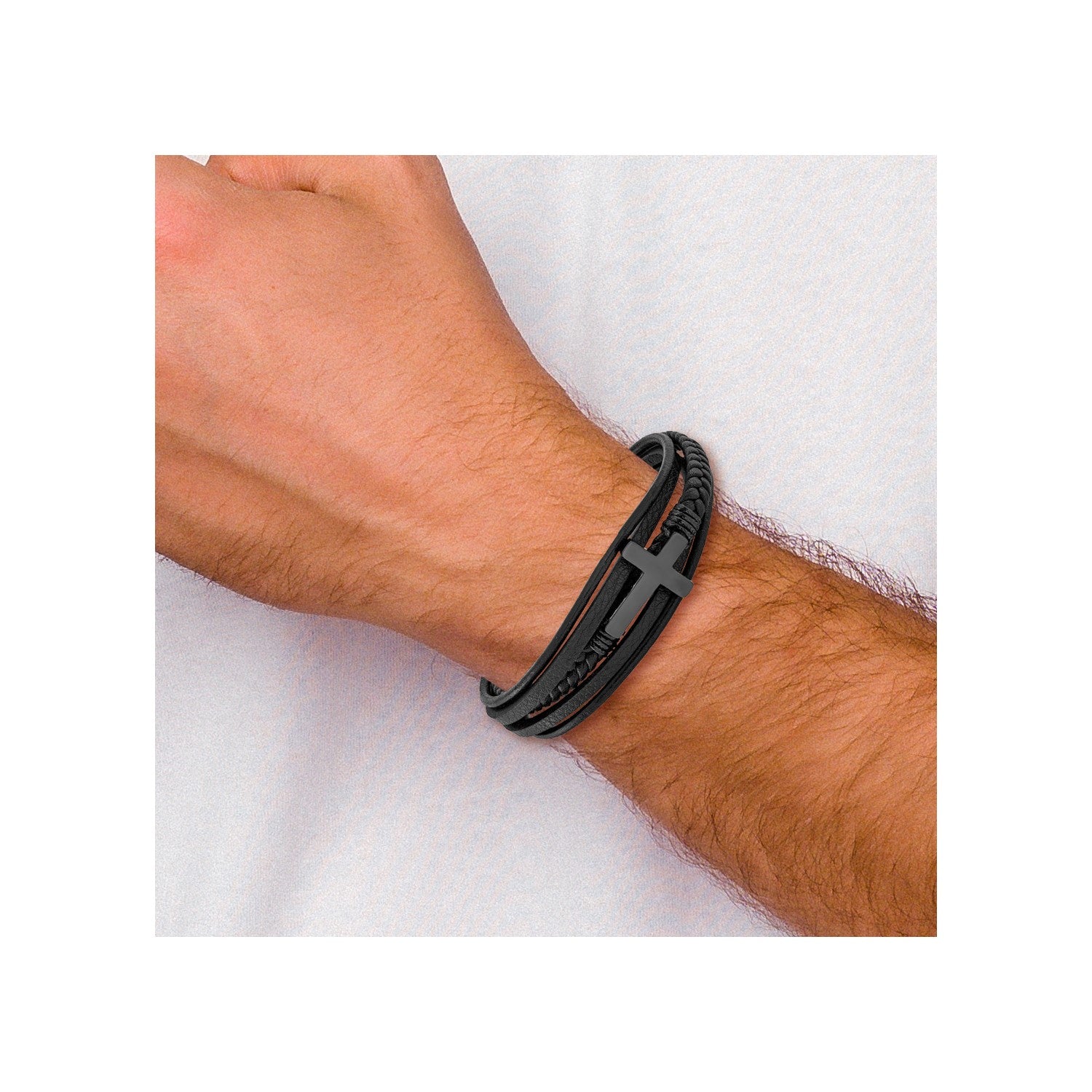 MJ Stainless Steel Polished Black IP-plated Cross Black Polyurethane and Leather Multi Strand 8.75 inch Bracelet