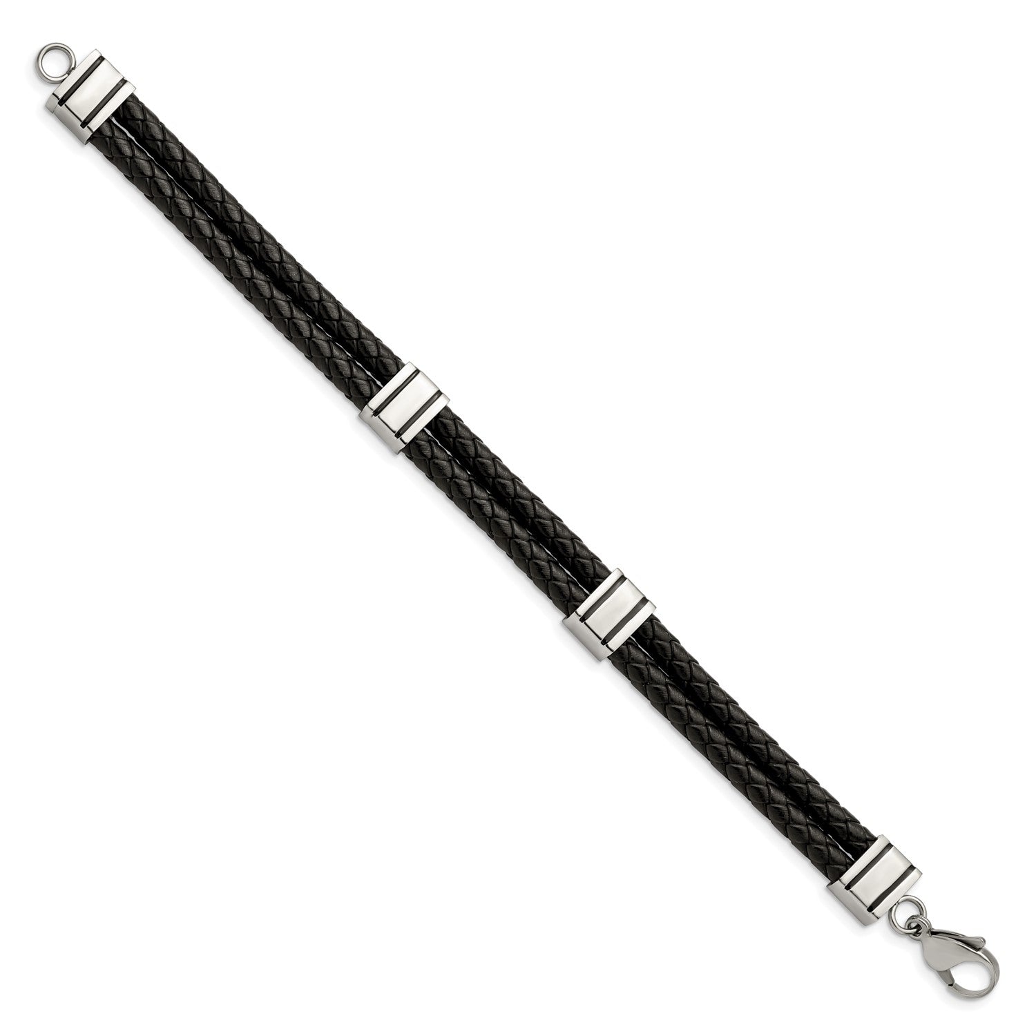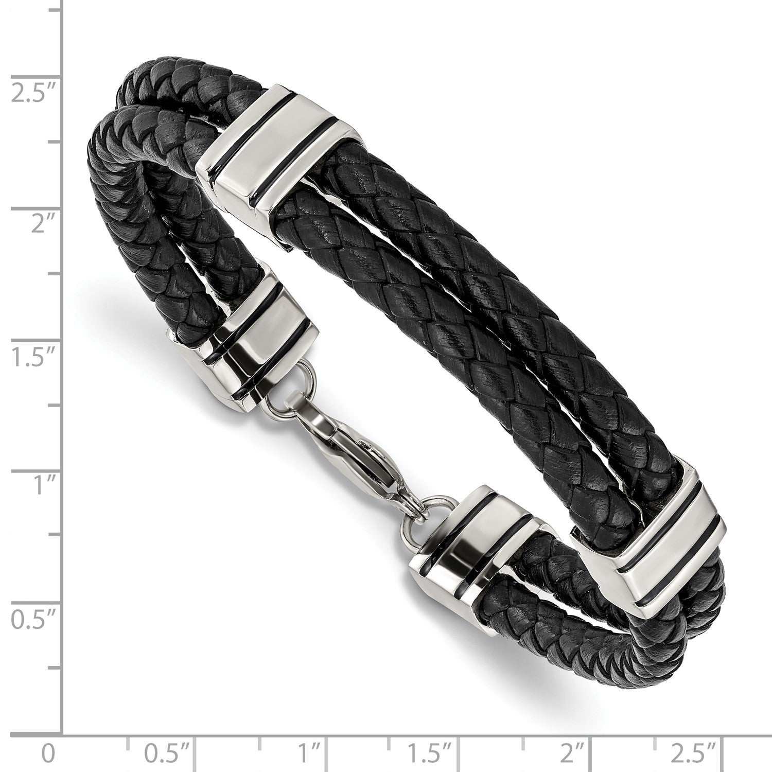 MJ Stainless Steel Polished Braided 2 Strand Black Braided Leather 9 inch Bracelet