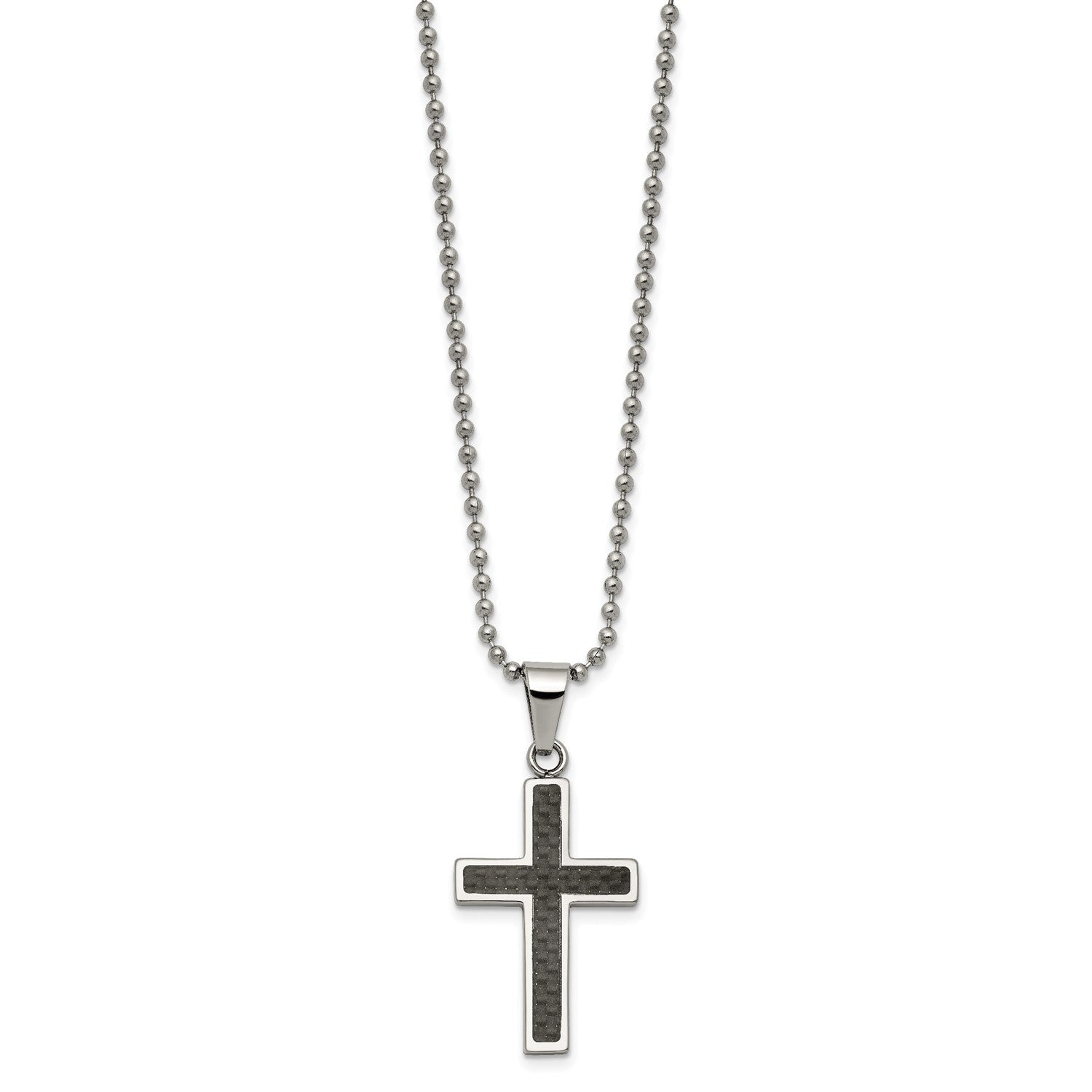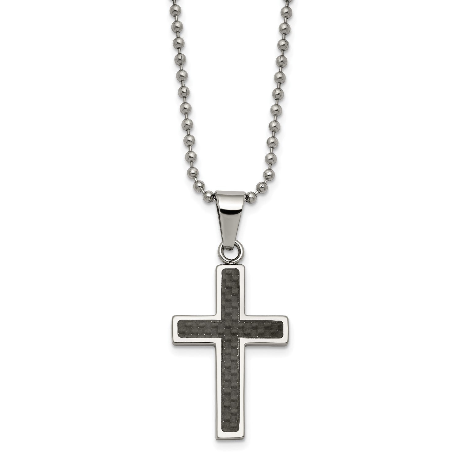 MJ Stainless Steel Polished with Black Carbon Fiber Inlay Cross Pendant on a 22 inch Ball Chain Necklace