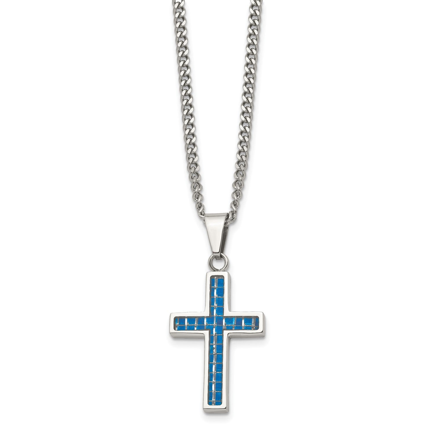 MJ Stainless Steel Polished with Blue Carbon Fiber Inlay Cross Pendant on a 20 inch Curb Chain Necklace