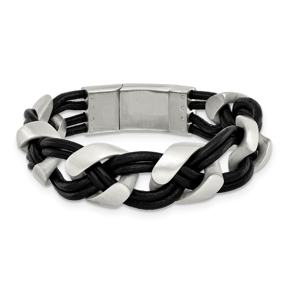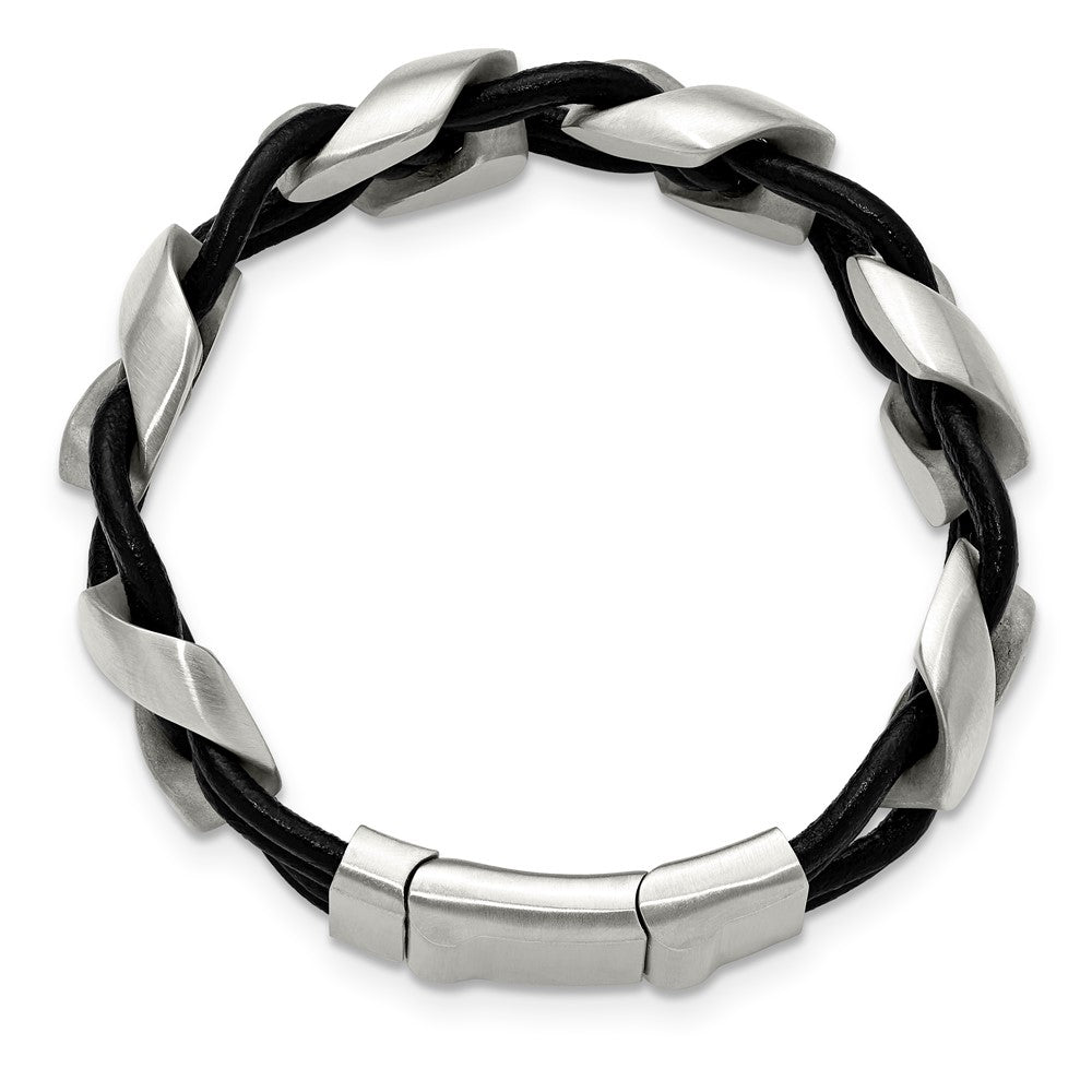 MJ Stainless Steel and Black Leather Braided 8.5 inch with .75 inch extension Bracelet