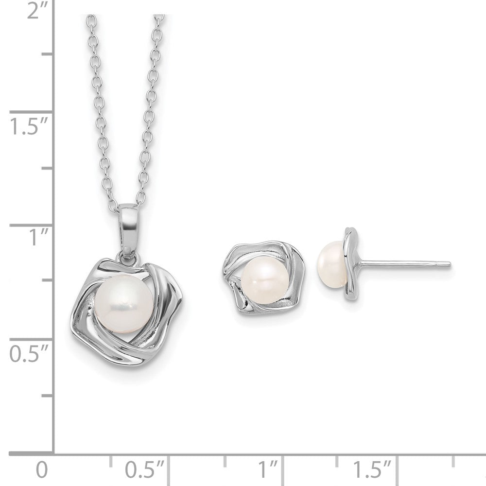 PSSN Sterling Silver Rhodium-plated 5-7mm White Button Freshwater Cultured Pearl 18 inch Necklace and Post Earrings Set