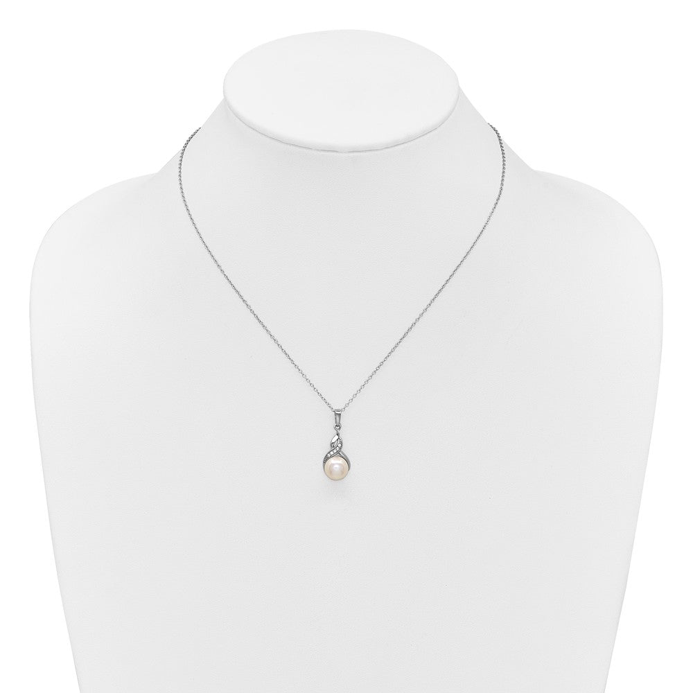 PSSN Sterling Silver Rhodium-plated 7-9mm Button White Freshwater Cultured Pearl and CZ 17 inch Necklace and Post Earring Set