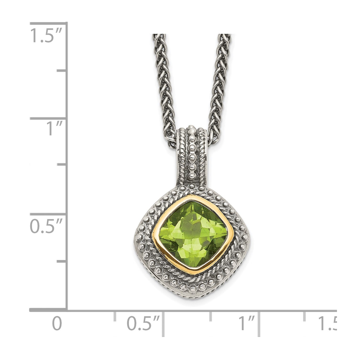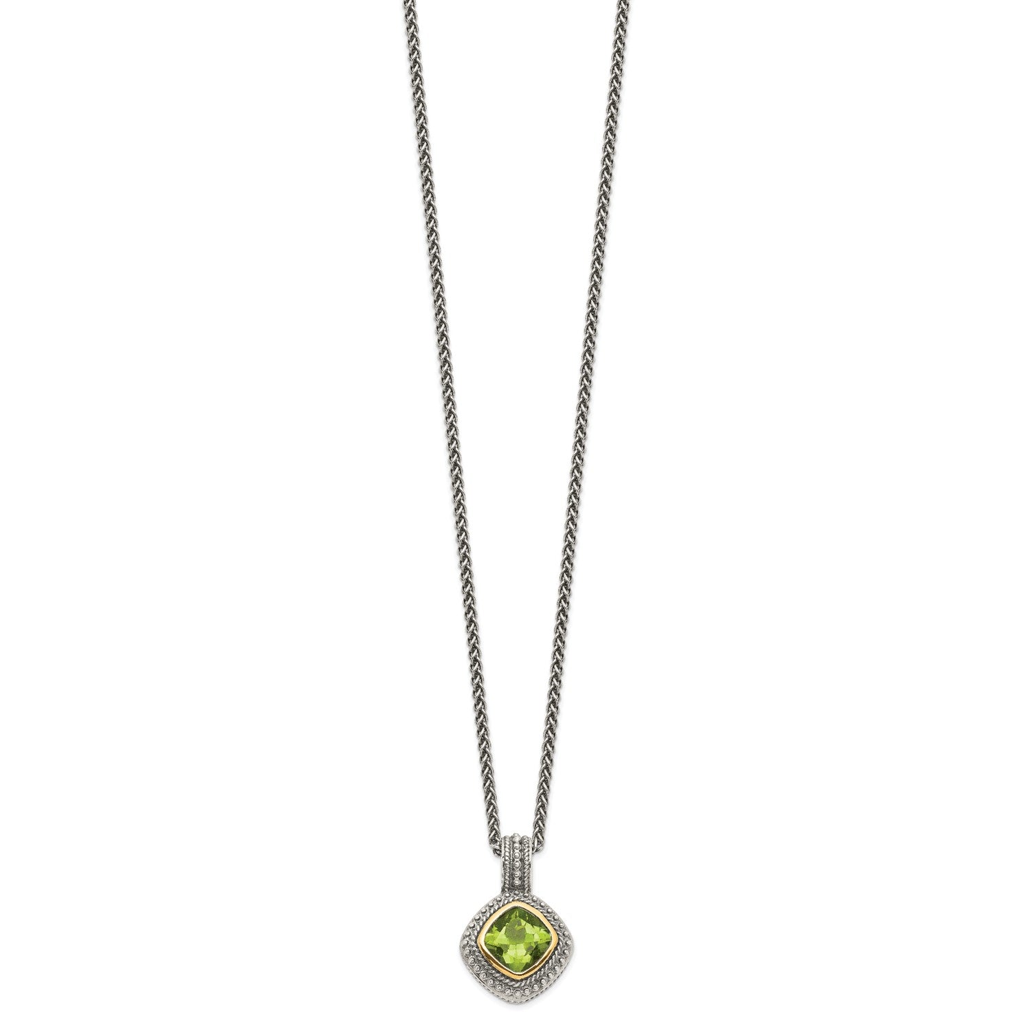 GSS Sterling Silver with 14K Accent 18 Inch Antiqued Cushion Bezel Peridot Necklace