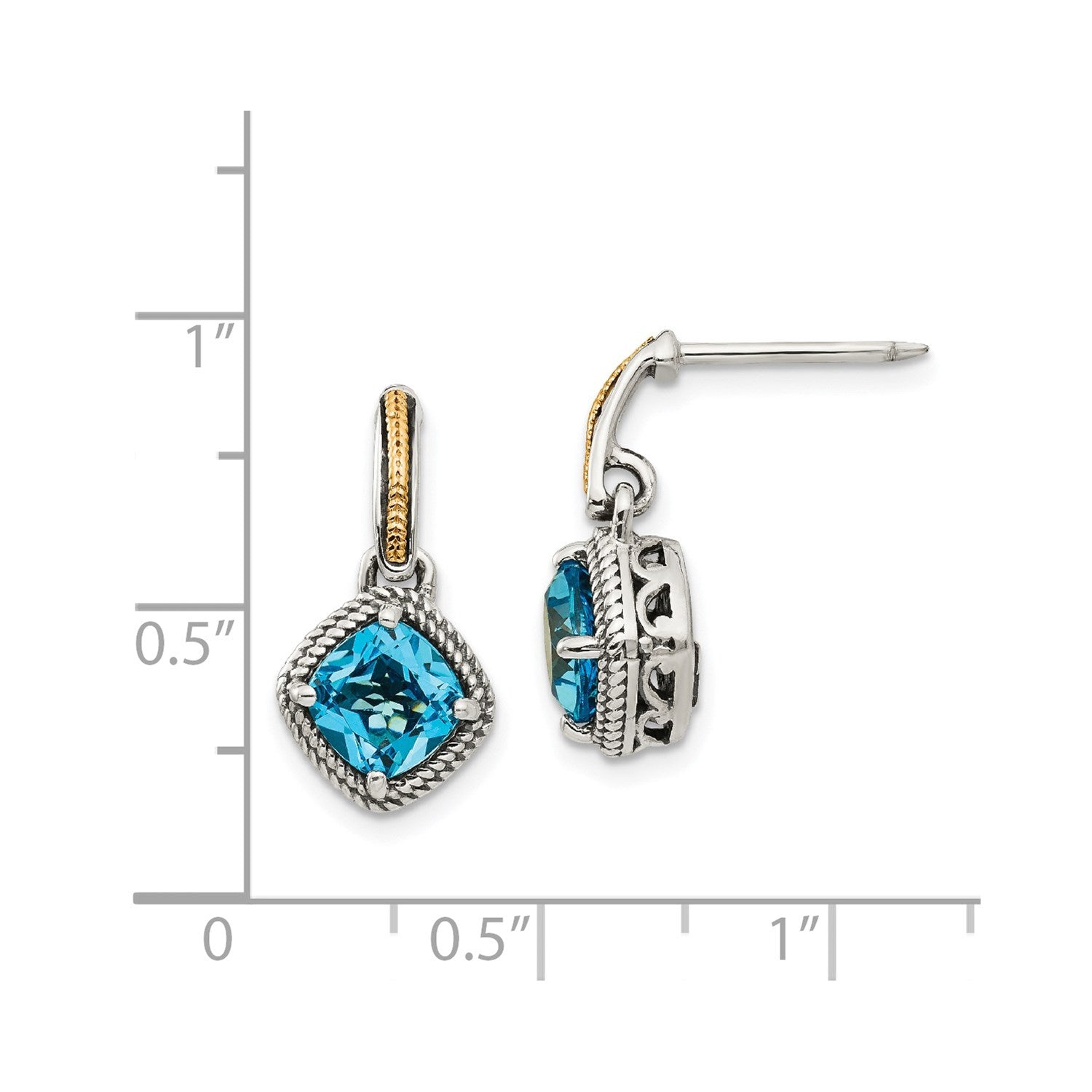 GSS Sterling Silver with 14K Accent Antiqued Cushion Light Swiss Blue Topaz Post Dangle Earrings