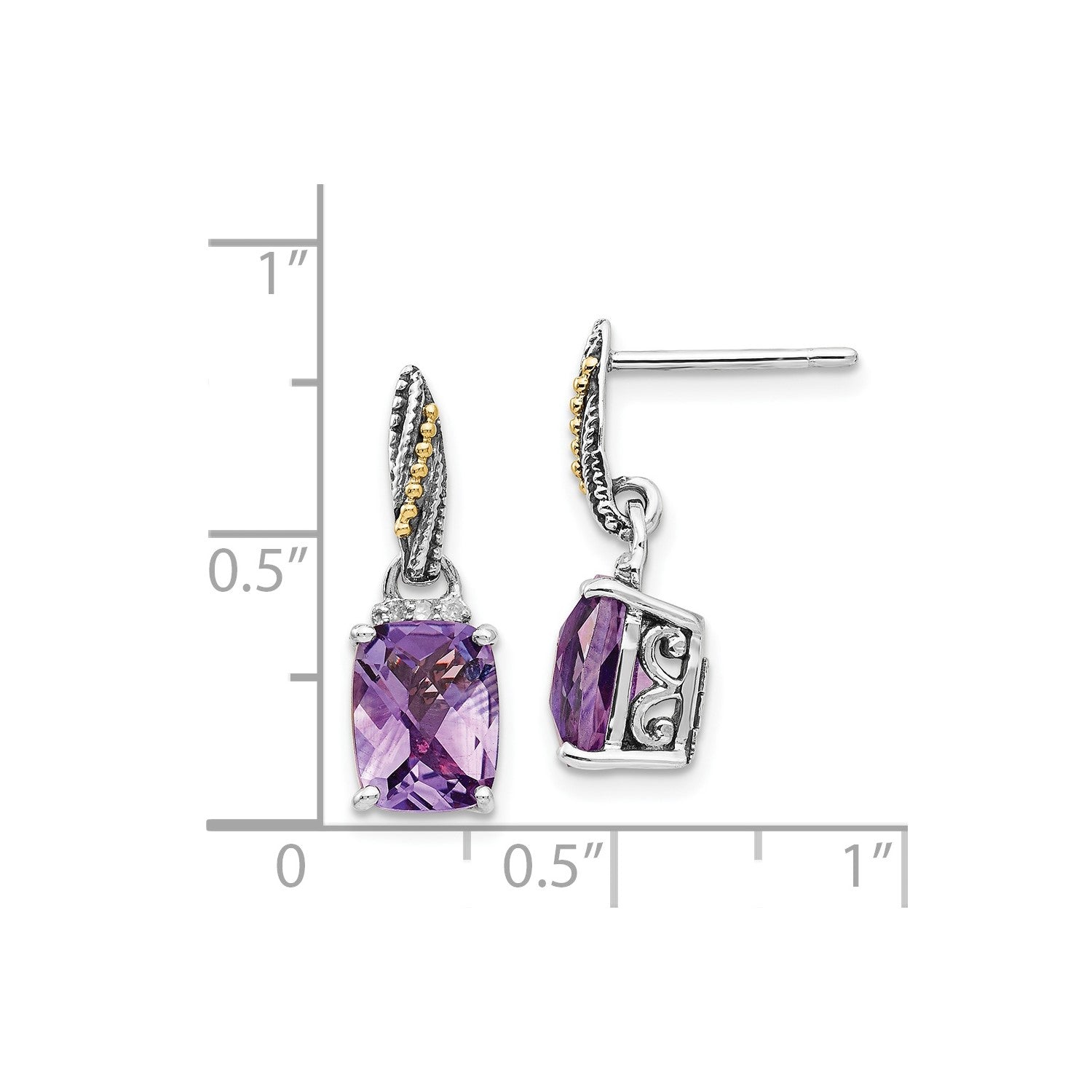 GSS Sterling Silver with 14K Accent Antiqued Diamond and Cushion Amethyst Dangle Post Earrings