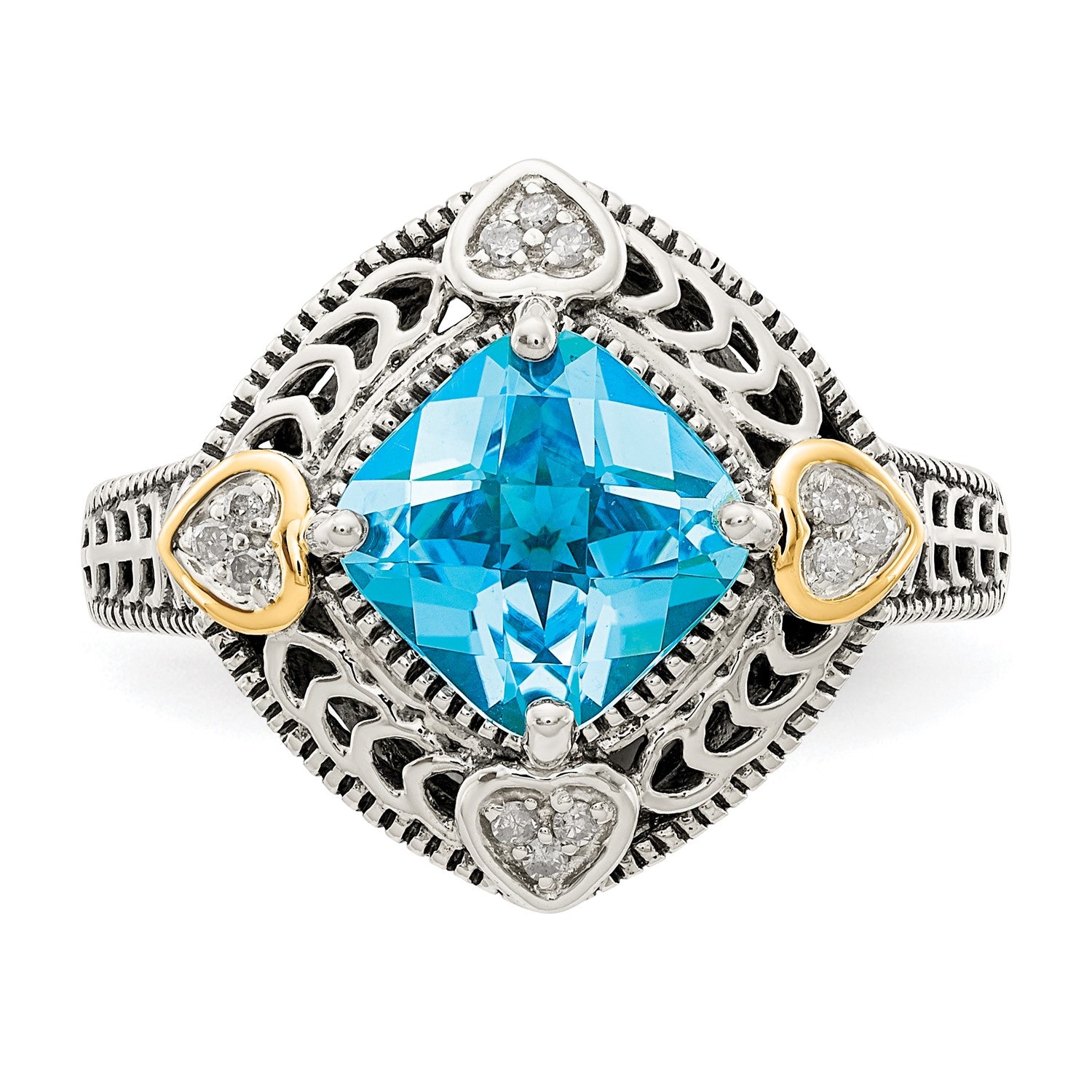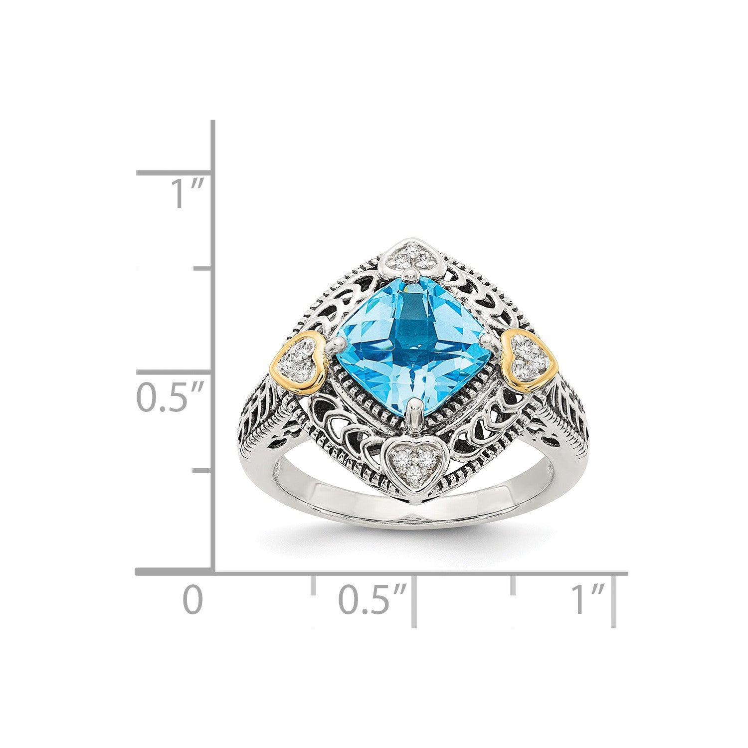 GSS Sterling Silver with 14K Accent Antiqued Diamond and Cushion Blue Topaz Ring