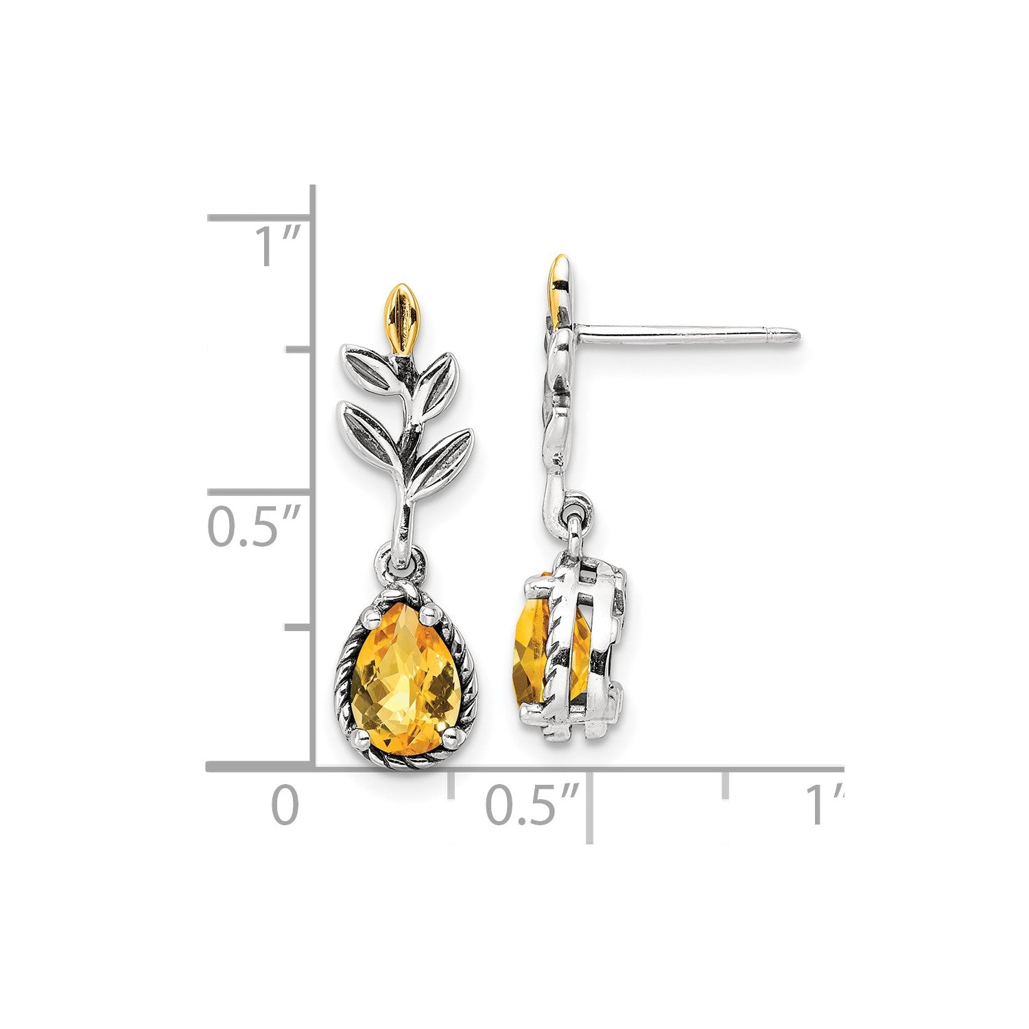GSS Sterling Silver with 14K Accent Antiqued Leaf Pear Shaped Citrine Dangle Post Earrings