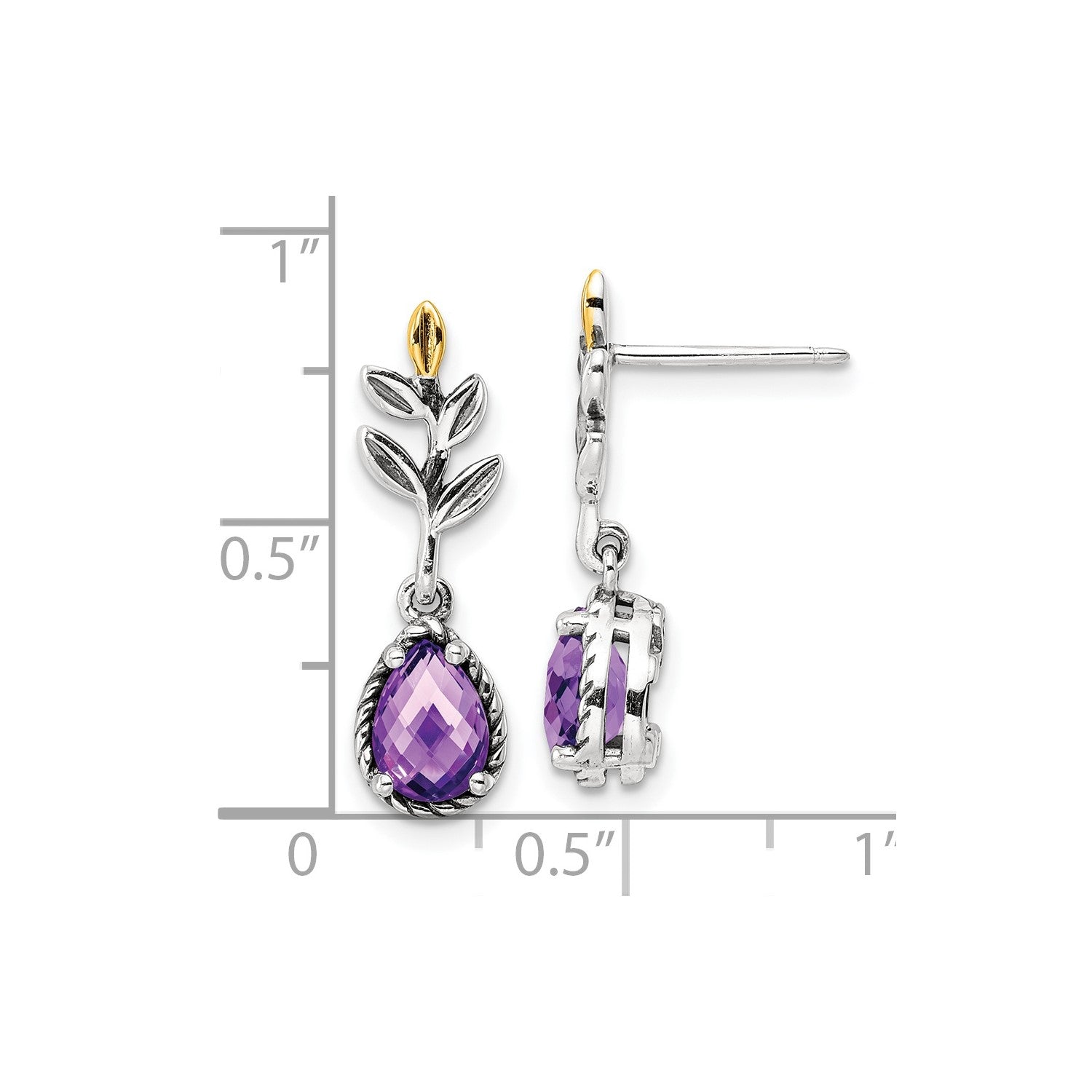 GSS Sterling Silver with 14K Accent Leaves with Pear Shaped Checkerboard Amethyst Dangle Post Earrings